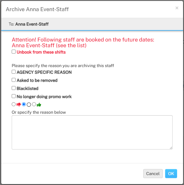 - If this person is booked onto shifts, you must unbook them first. You can do so by ticking the checkbox.